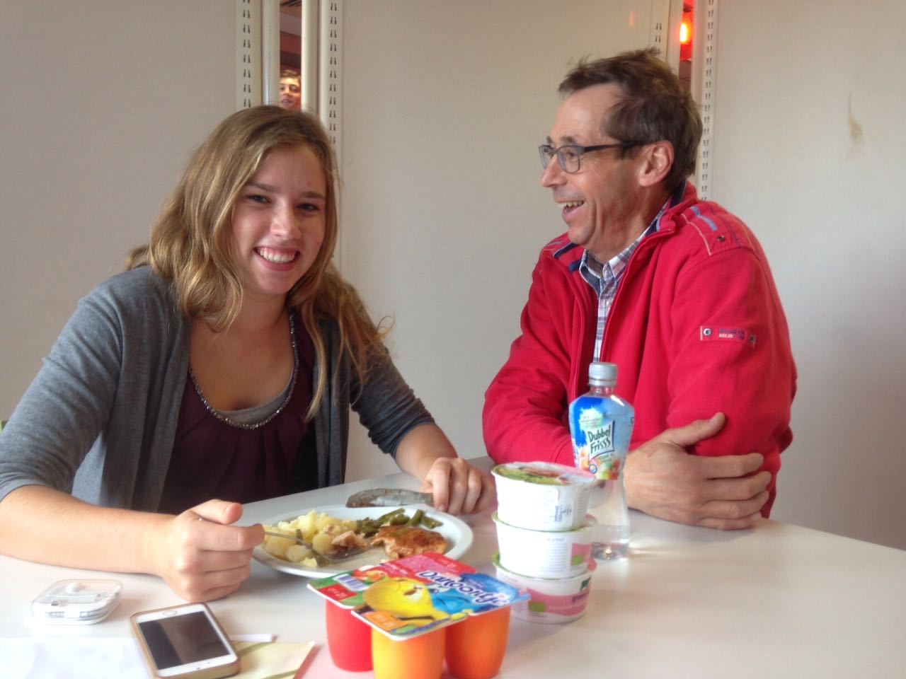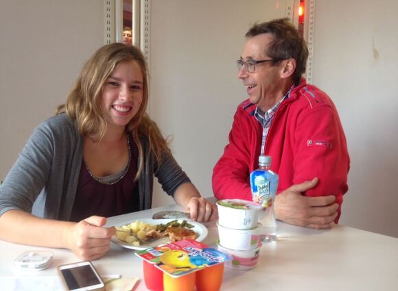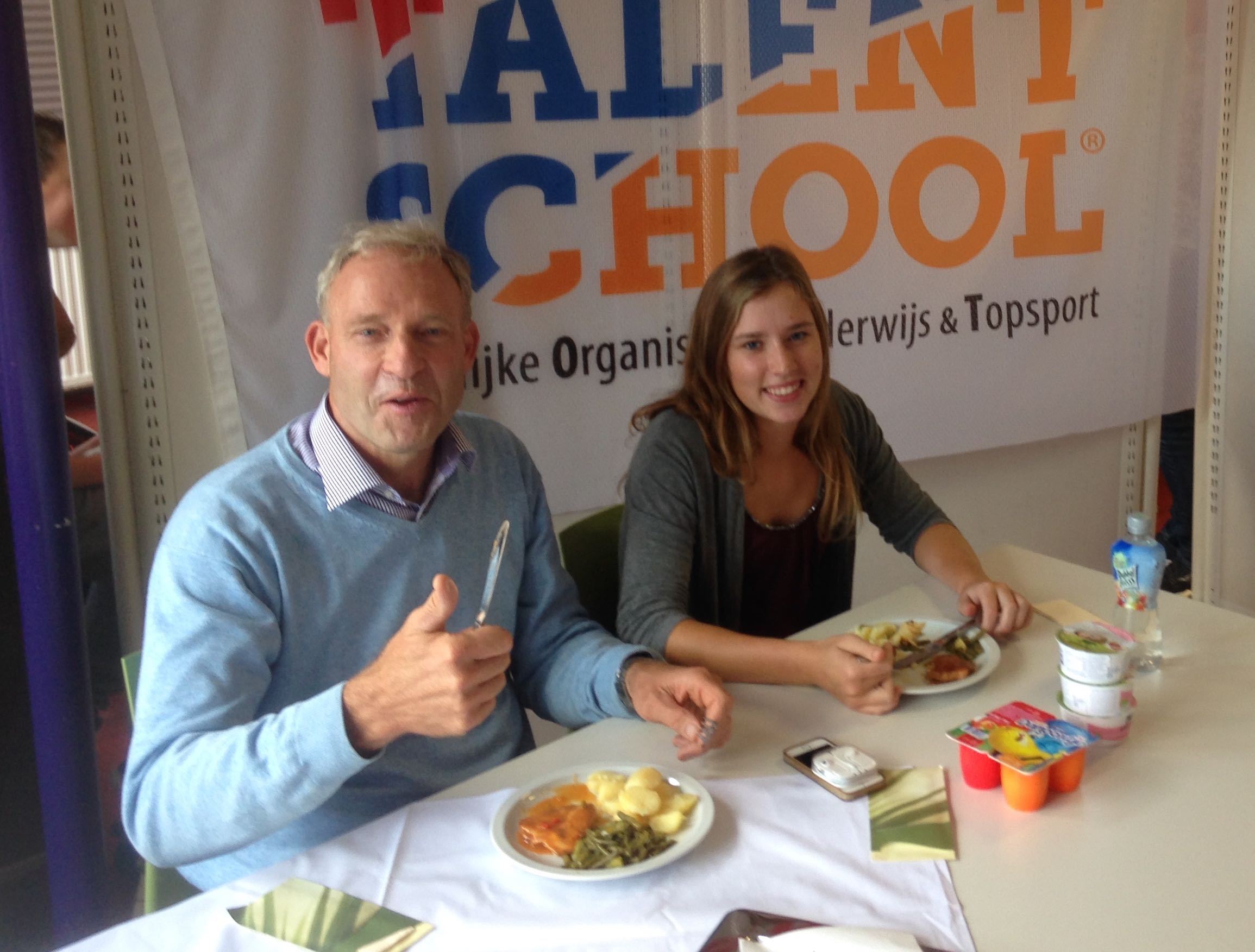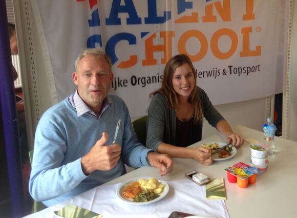 LOOT Coordinator Jan Deuss was zeer in zijn nopjes toen volleybalspeelster Lotte (voor 6 euro) de door Delifrance geleverde gezonde maaltijd zich liet smaken.