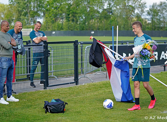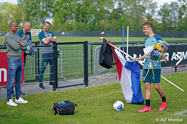 ZAANSTAD- Kenzo Goudmijn werd woensdag tijdens de training van AZ 1 verrast door drie docenten. Op het AFAS Trainingscomplex kreeg de jonge middenvelder te horen dat hij zijn havo-diploma heeft gehaald. “Bijzonder dat Kenzo het voor elkaar heeft gekregen.”